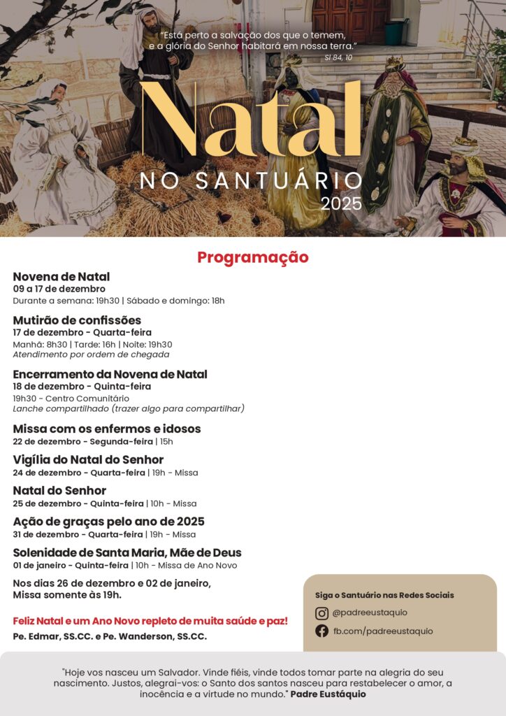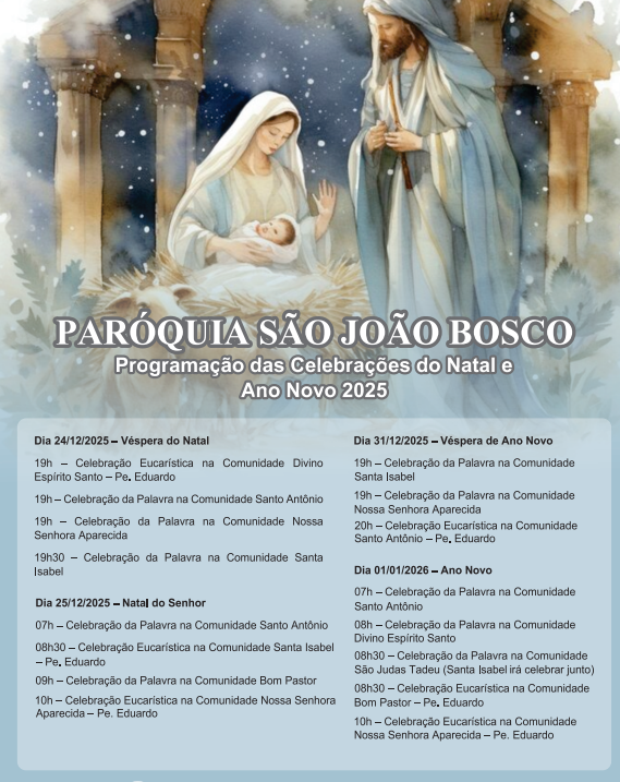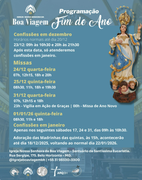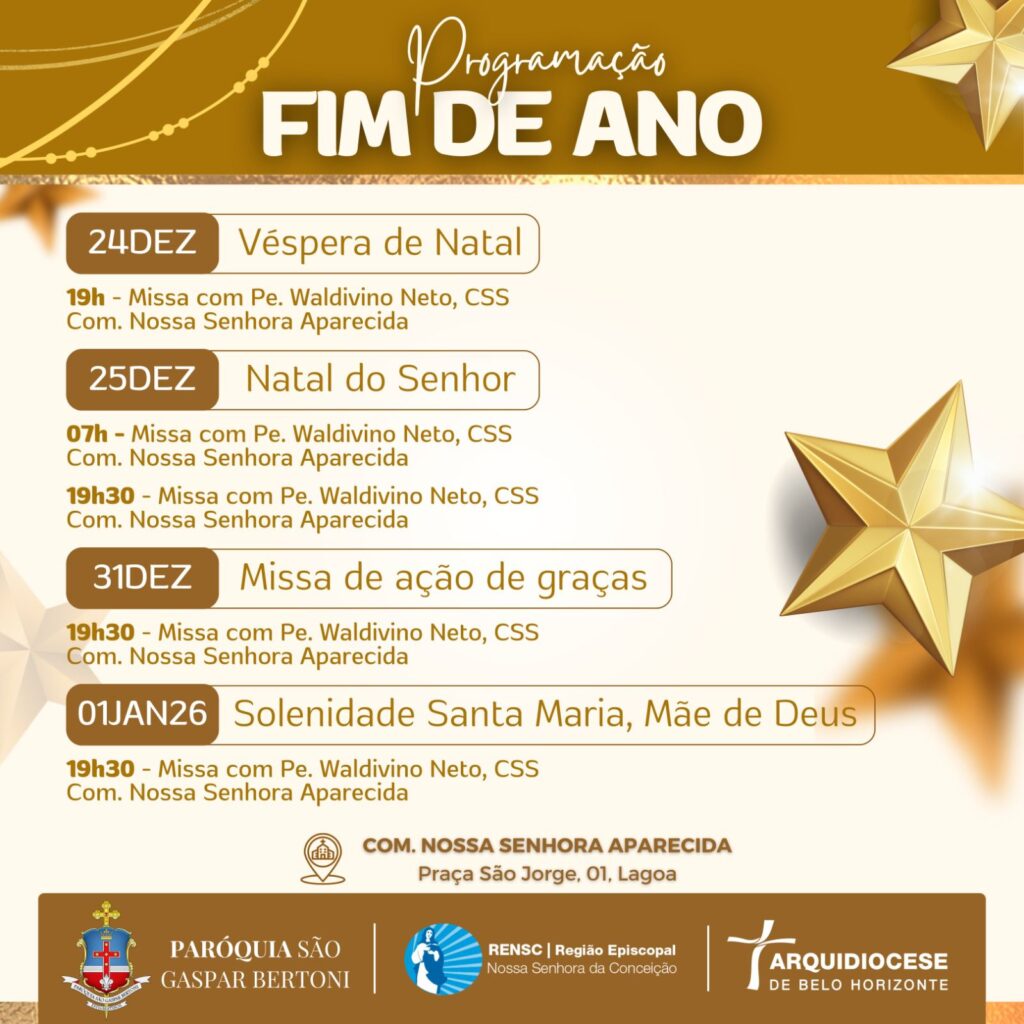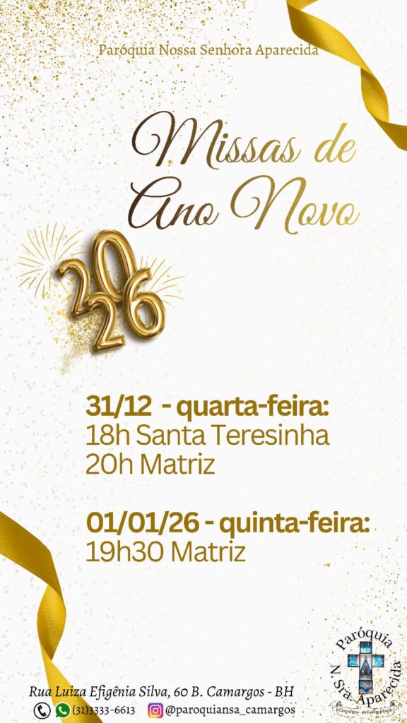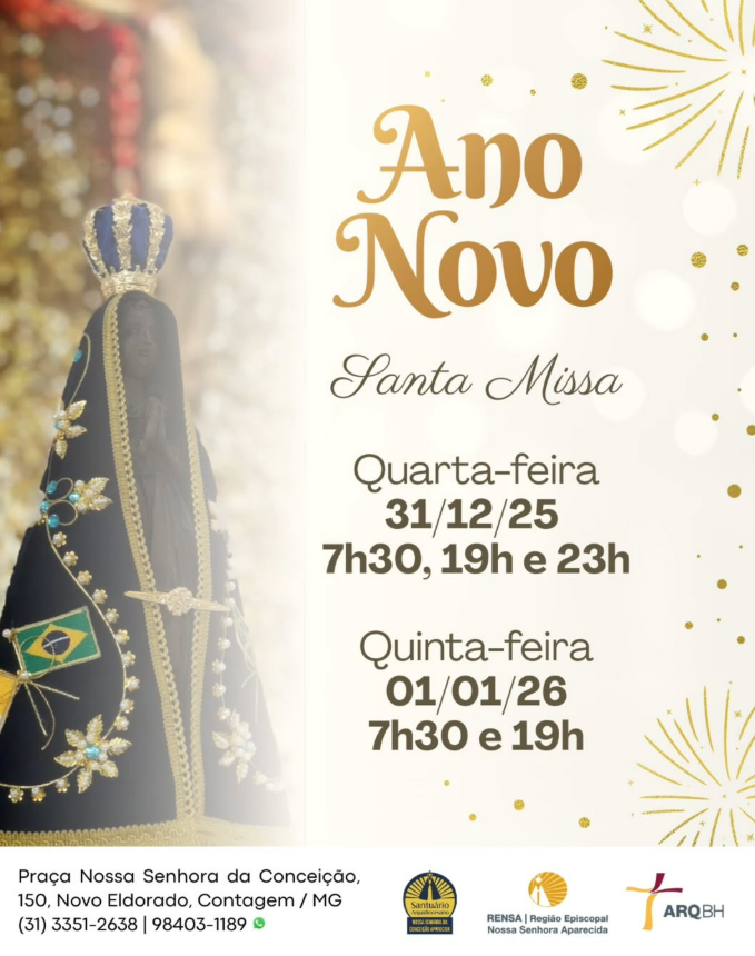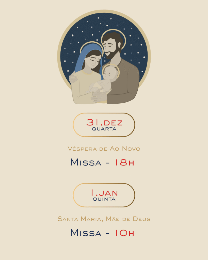 No dia 31 de dezembro, quarta-feira, a Missa de Véspera de Ano Novo será presidida às 19h30. Já no dia 1º de janeiro, a Celebração Eucarística de Santa Maria, Mãe de Deus, também será às 19h30. Acompanhe a programação, a seguir, e participe com sua família e amigos destes momentos especiais de comunhão e fé!🙏