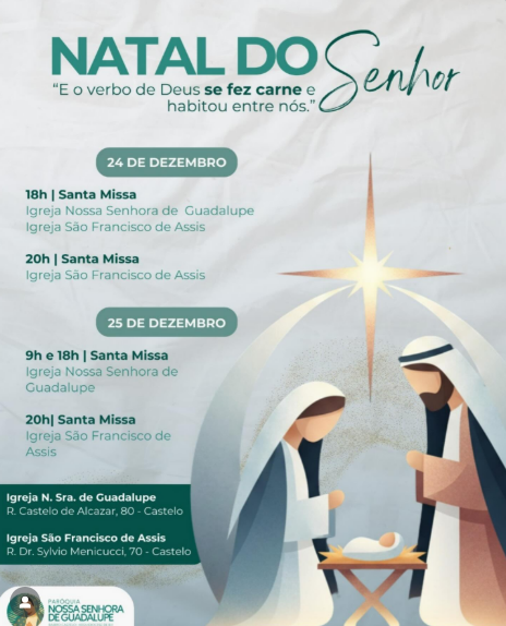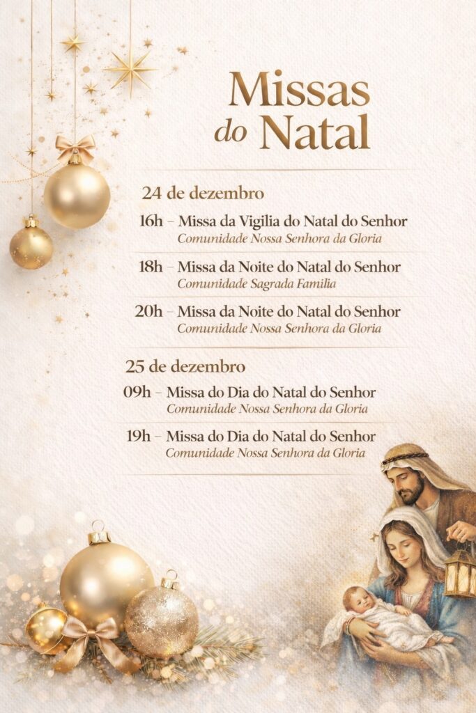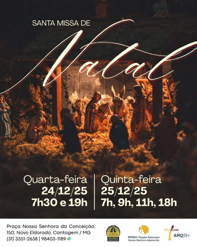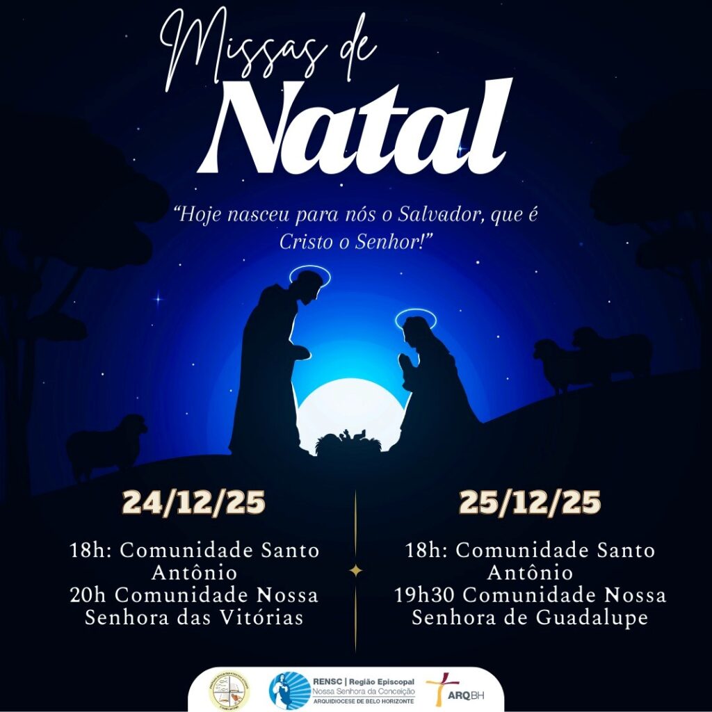 Inspiradas pelo Tempo do Natal e em preparação para o nascimento de Jesus, as comunidades de fé da Arquidiocese de Belo Horizonte convidam fiéis e suas famílias para programação especial de Natal e Ano-Novo que contempla cantatas, apresentações artísticas, novenas e Santa Missa, reunindo espiritualidade, cultura e fé.