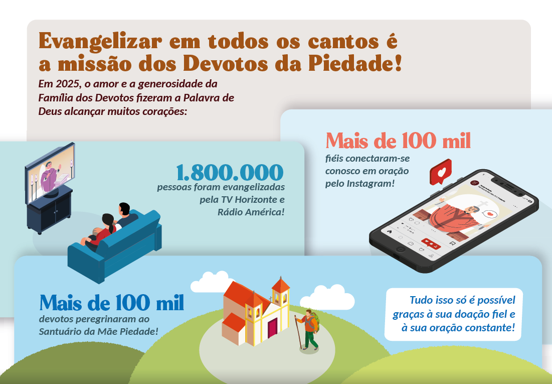 Graças à Família dos Devotos de Nossa Senhora da Piedade muitas graças são alcançadas, todos os dias, em um bonito e necessário trabalho de evangelização, de cuidados com o Santuário da Mãe Piedade e com as obras sociais que amparam nossos irmãos mais pobres.