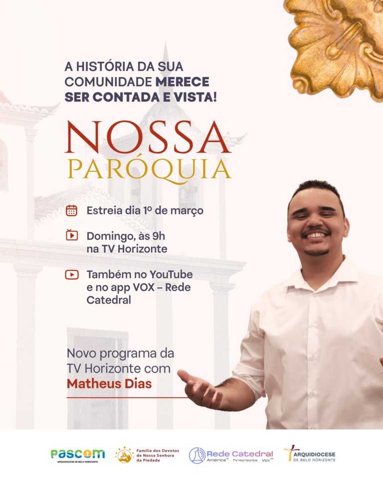 Neste mês de março, a TV Horizonte traz uma novidade especial: a estreia do programa Nossa Paróquia. A nova produção é um convite para os fiéis conhecerem as comunidades de fé da Arquidiocese de Belo Horizonte, acompanhada da presença da Mãe Piedade, a imagem peregrina da padroeira de Minas com o apresentador Matheus Dias em cada episódio.