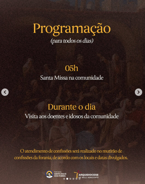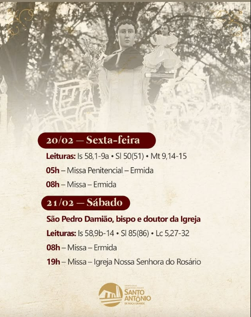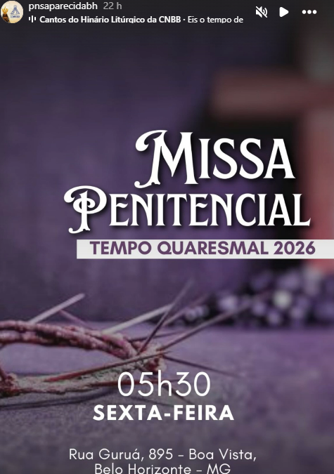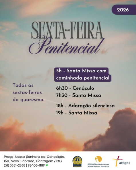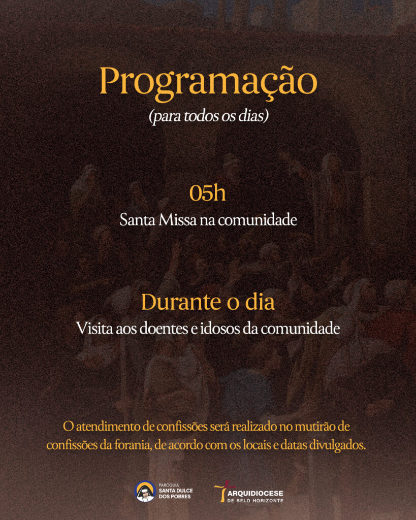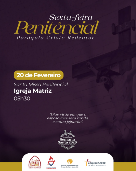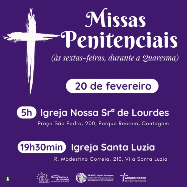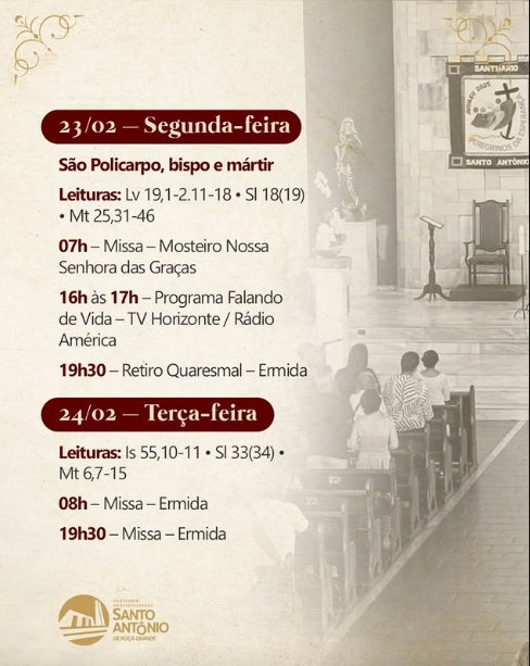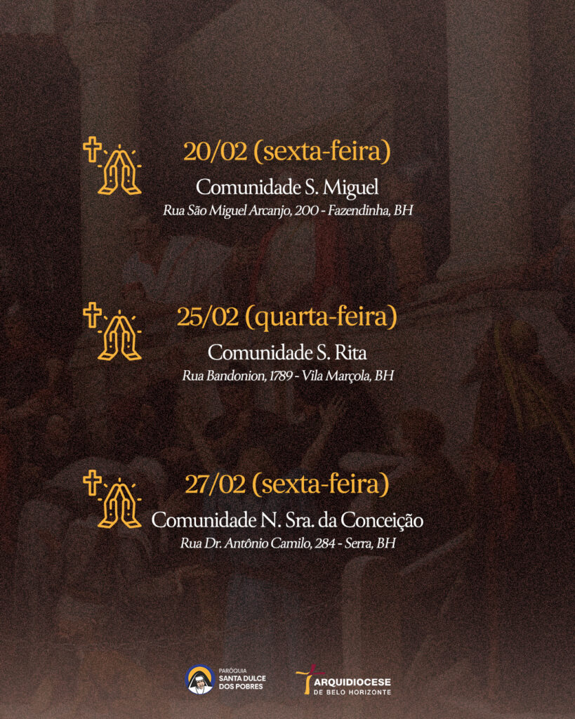 | 20/02 | SAGRADO CORAÇÃO DE JESUS | 19:30 | Rua Pouso Alto, 329, Novo Horizonte, Betim, MG |
