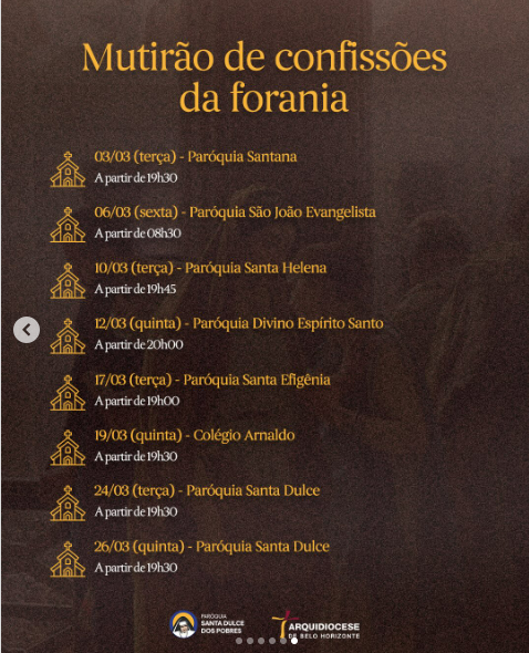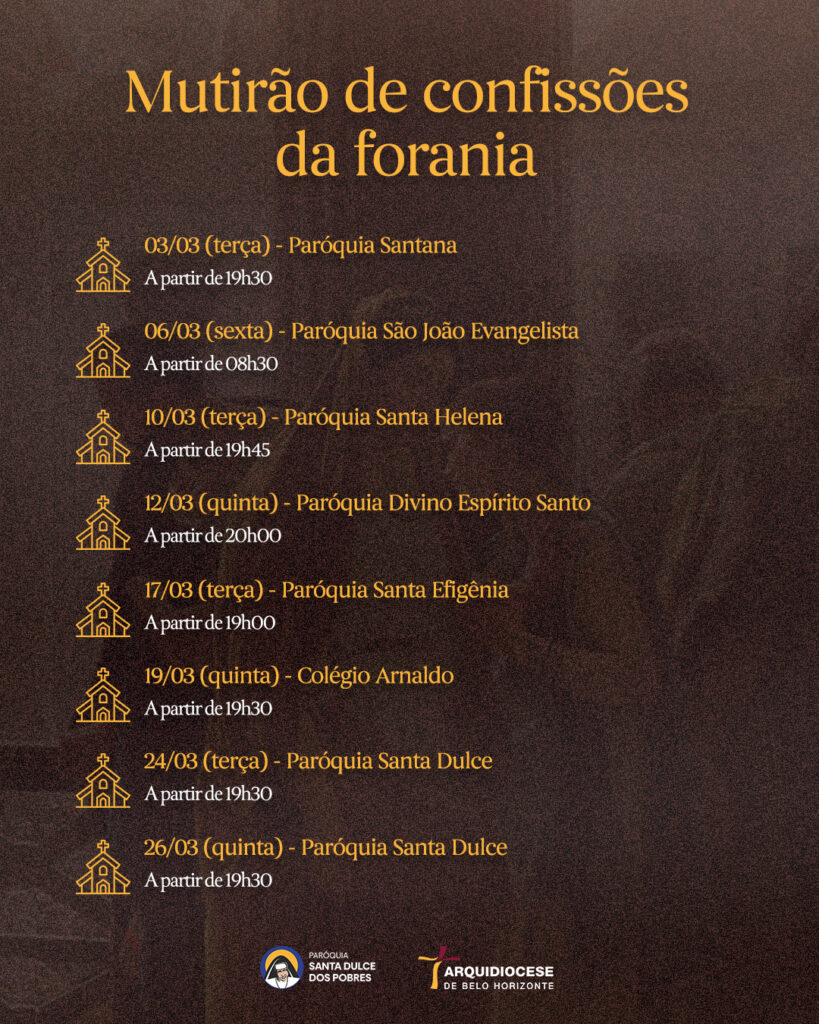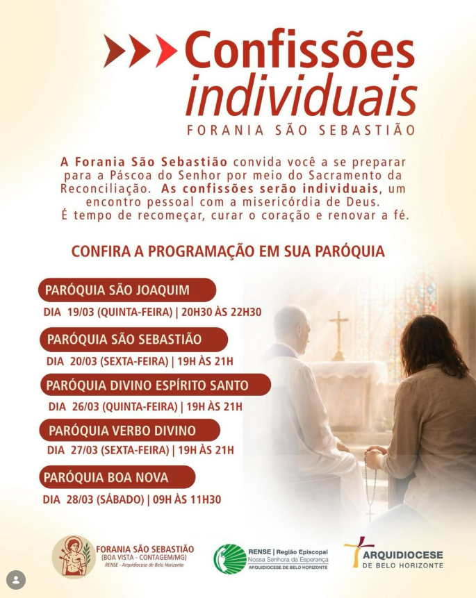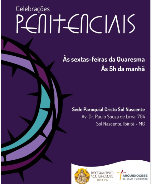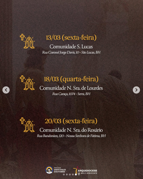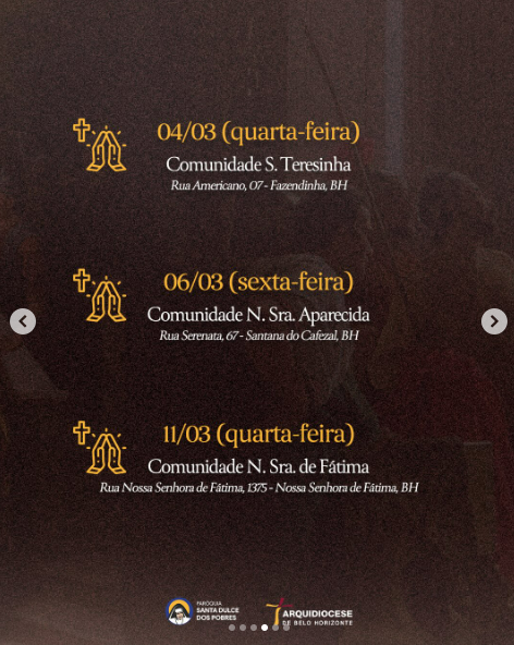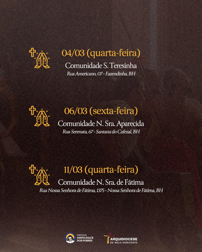 | 06/03 | SAGRADO CORAÇÃO DE JESUS | 19:30 | Rua Pouso Alto, 329, Novo Horizonte, Betim, MG |