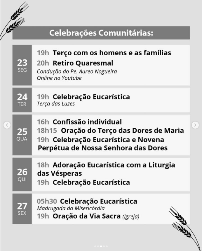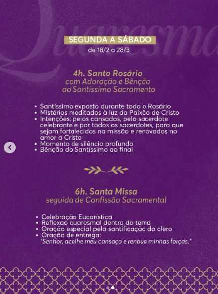 A Quaresma nos prepara para celebrar a Páscoa do Senhor e também nos ajuda a fortalecer a nossa fé e os nossos corações. Acompanhe, a seguir, as programações nos Santuários, paróquias e comunidades da nossa Arquidiocese: Missas, atendimento de confissões, Via-sacra, e reflexões)!